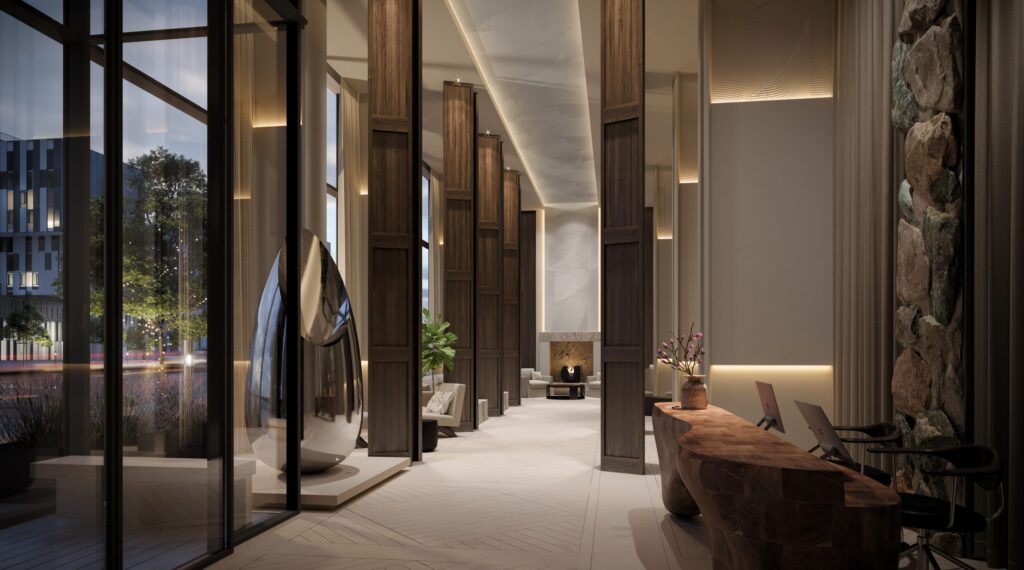 Oversized windows open into an animated streetscape and fill the lobby with natural light, welcoming you to Canary House. A large fireplace anchors one end of the extended foyer while natural woods and locally sourced stone frame your path through this natural gathering space. Find your favourite nook among a collection of sumptuous seating and get carried away by the ambiance. This is more than an entrance, it’s an extension of your home.