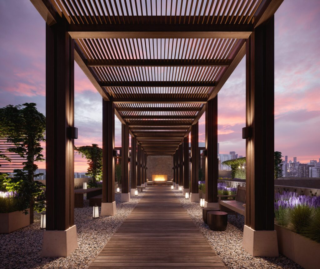 Immerse yourself in nature as you stroll through the garden. This patio in the sky wraps itself around three sides of the building, offering unmatched views of Toronto’s majestic skyline while guiding you to a welcoming fire pit. The garden has a number of different areas to explore, each with its own energy. Entertain al fresco and dine under the stars or discover your own patch of paradise in a more private alcove. Let the pergola frame an unforgettable evening.
